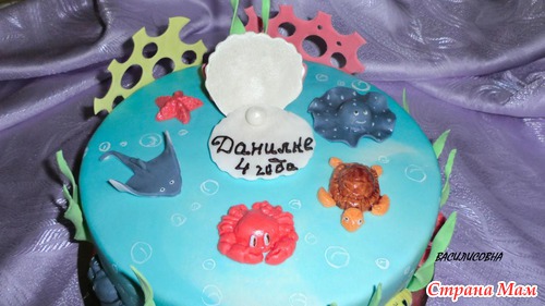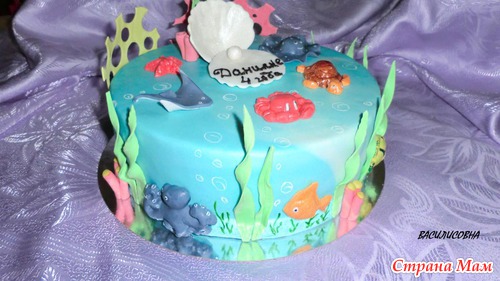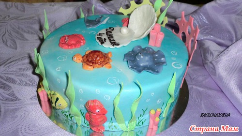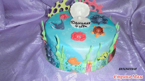 Тортик предназначался маленькому любителю подводного мира... Внутри ванильный шифон, персики и сливочно-творожный крем, под мастику полуганаш, мастика ММ, вес 3300