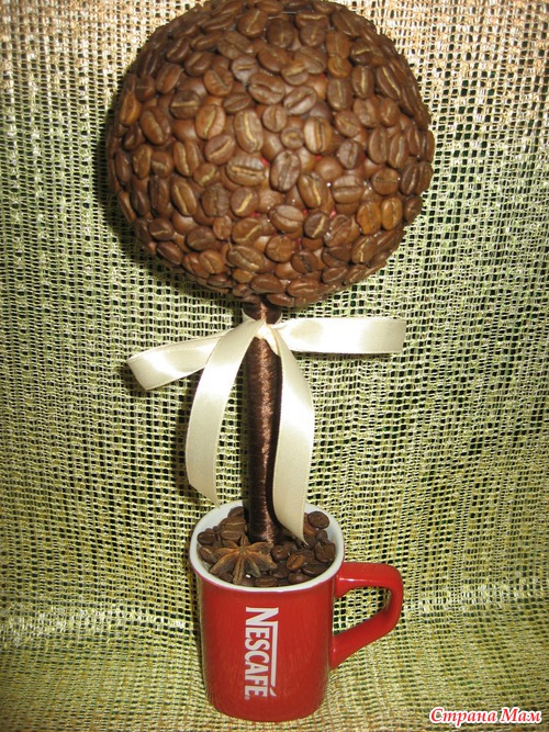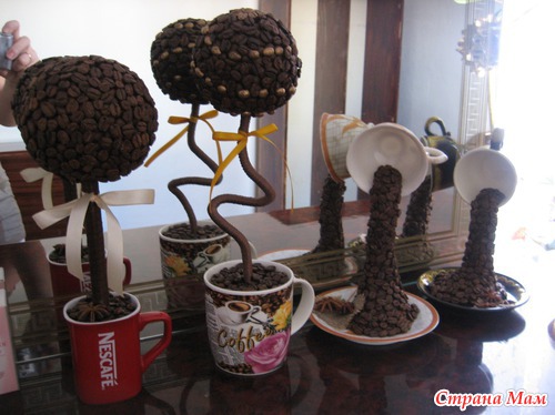 Привет странамамочки! Вот наконец и у меня нашлось время показать мои кофейные творения. От кофе я просто брежу и в планах у меня еще разные картины из кофе, которых в нете можно встретить очень много. А пока просто фото того, что я сделала. Работа интересная, но немного нудноватая, но результат того стоит. Ведь так приятно слышать возгласы своих друзей, смотреть как они принюхиваются к аромату исходящему от топиариев. А вот мои новые наборы из блюдца и бокальчика в готовом виде пока не видел еще ни кто, только старшая сестра видела, когда они были в процессе. Ну вот и фото: