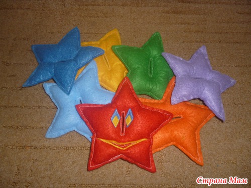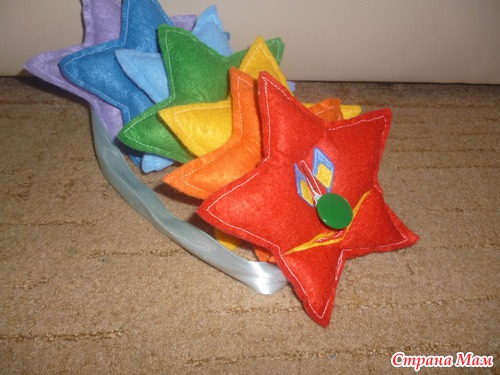 Одна из них это звездочки, слегка набитые холлофайбером, которые одеваются на ленточку через пуговку