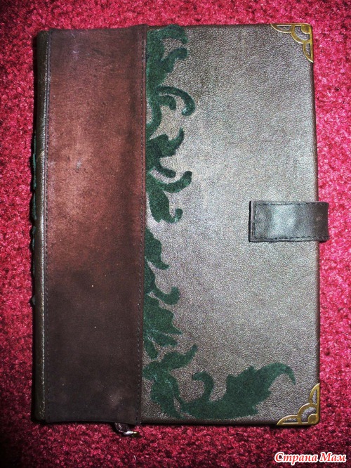 Формат А5, коптский переплет, 96 листов (белых и несколько бледно-зелёных), обложка - кожа, замша, магнитная застёжка, металлические декоративные уголки.