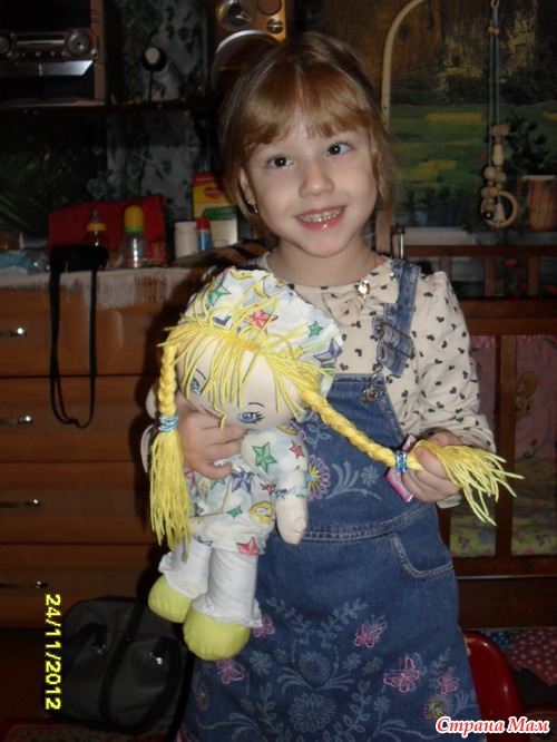 потом, Поля попросила куколку заплести.(кстати, пока я возилась с косичками, Полинка одела сарафанчик!!!)