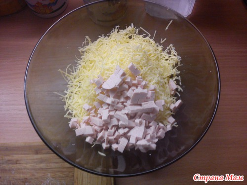 1. Колбасу нарезаем кубиками, сыр натираем на мелкой терке.