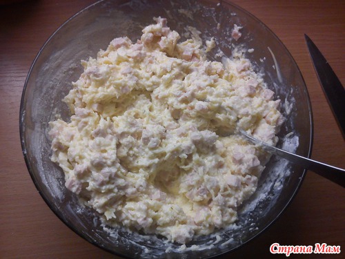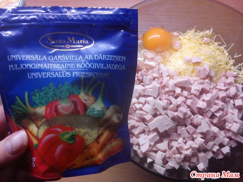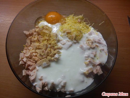 2. Смешиваем - сыр, колбасу, приправу, яйцо.