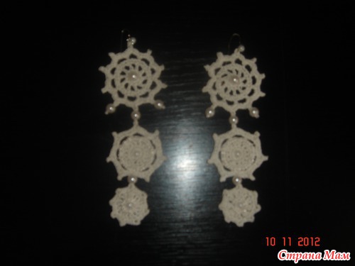 Серёжки связаны крючком, украшены бисером и бусинами, фото, к сожалению, лучше не получается. 1 пара 300 руб. Можно в другом цвете, по желанию. Возможны так же другие вариации снежинок, в один, в два яруса. Читать полностью