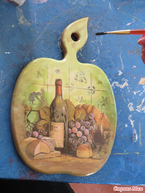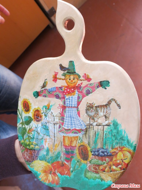 Купите деревяную дощечку для разделывания продуктов, трехслойную салфеточу с понравившемся рисунком, клей ПВА, плоскую кисть, белую акриловую краску. Когда все будет готово можно начинать!