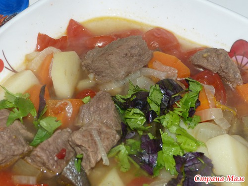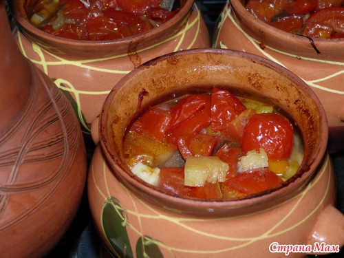 Нам нужно - горшки (по количеству едаков или один большой), мясо (у меня говядина, в оригинале свинина), картошка, морковь, лук, перец болгарский, чеснок, помидоры, зелень, соль, перец, бульон (или вода), примерно 2 часа времени.
