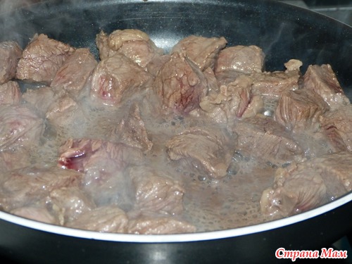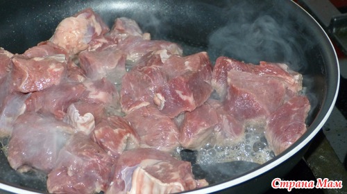 Мясо режем на куски, которые можно сразу положить в рот. Обжариваем на сковороде. Я всегда жарю мясо на сухой сковороде. Это блюдо не стало исключением.