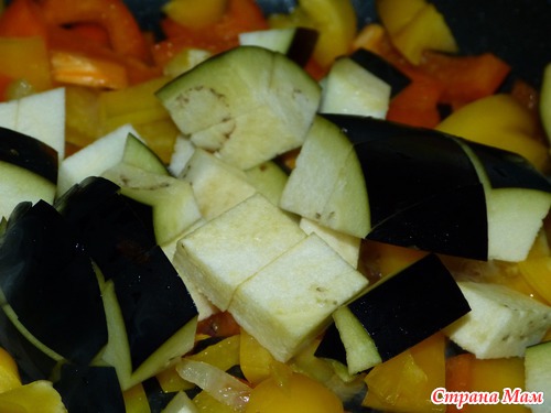 На другой сковороде будем обжаривать овощи. По очереди лук, перец, баклажан (я схалтурила и обжарила их вместе).