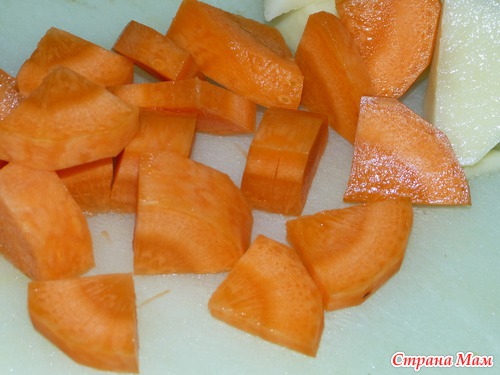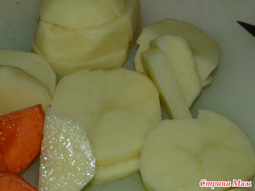 Картошку и морковь режем дольками, не крупными, чтоб было легче тушить и меньше риск, что не проготовятся.