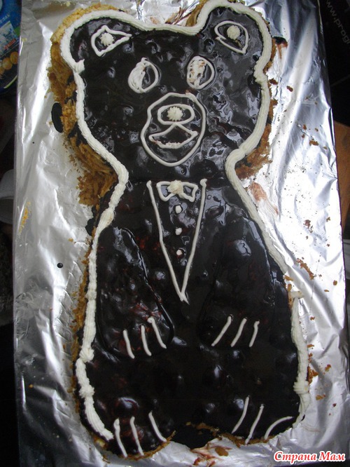 Девочки! Захотелось мне испечь торт на годик крестнику. Самым удачным у меня выходит медовик. Украшать я не большой мастер. И вот нашелся у меня рисунок медведя. Вот что у меня получилось: