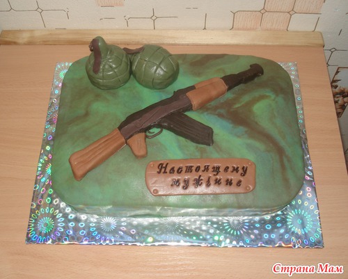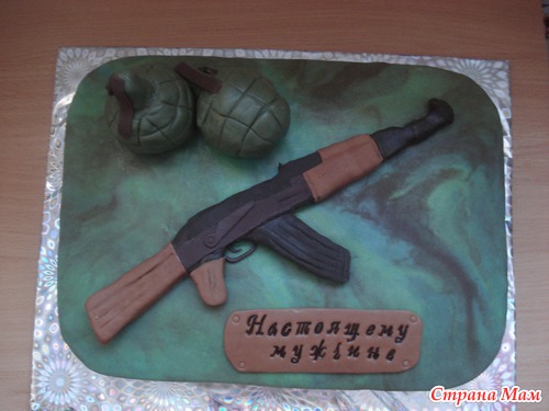 . За основу автомата взяла медовый корж, сразу выпекла его в форме автомата, а потом обтянула мастикой разных цветов. Гранаты тоже желала медовыми, мини-тортики внутри получились. Только вот гранаты вообще подгулявшими вышли. мастика молочная была, а т. к она оч пластичная, вот и перемещалась сама под собственным весом