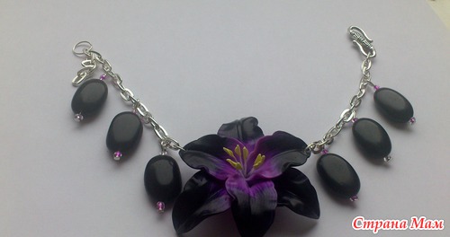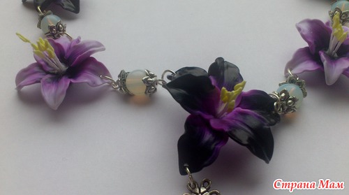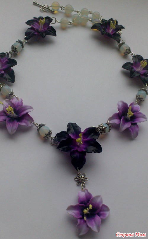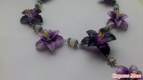 Вот и снова я))). Сегодня я к вам с фантазийными цветами. Колье, серьги и браслет с лилиями и лунным камнем