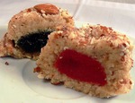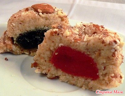 Измельчаем на крупной терке печенье. Отдельно измельчаем на терке с меньшими ячейками абрикосовые косточки. Добавляем к тертому печенью сгущенное молоко и размягченное сливочное масло. Тщательно перемешиваем. Полученную массу разделяем на 16 равных частей. Затем формируем руками лепешку, на середину которой выкладываем кусочек фруктового мармелада, и сворачиваем лепешку в шар. При этом мармелад должен оказаться в середине. Затем каждый кусочек прокатываем по ровной поверхности, чтобы он принял форму цилиндра, и обваливаем в крошке из абрикосовых косточек. Затем убираем пирожные на 1-2 часа в холодильник.