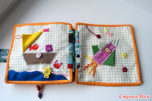 6. Море с рыбкой на веревочке, пароходик с парусом на пуговке и ракета с окошечком, звездочки на тесемочках.