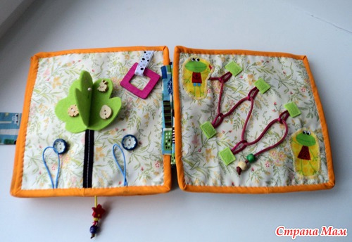 7. Объемное дерево с пуговками-цветочками и насекомыми, цветочки на стебельках-резиночках и шнуровка от лягушонка к лягушонку.