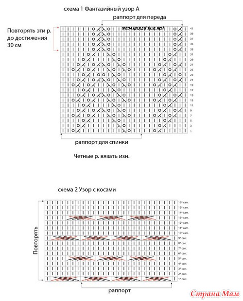 Спинка: спицами №4 набрать 96 п. и вязать 4 р. платочной вязкой. Перейти на вязание фантазийным узором А по схеме 1, повторяя раппорт для спинки. На высоте 30 см от начала вязания перейти на вязание узором с косами по схеме 2. На высоте 42 см от начала вязания перейти на вязание фантазийным узором В, прибавив с обеих сторон в каждом 2-м р. 4 раза по 1 п. На высоте 30 см от начала вязания фантазийным узором В все п. закрыть.