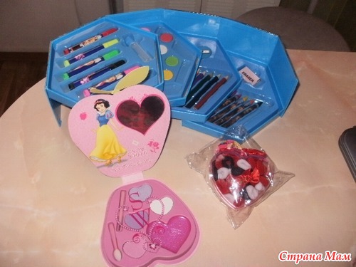 Спасибо огромное за такой праздник!!! Подарки-супер. Десткий обучающий компьютер, набор для рисования, косметический набор, набор резиночек. Ну повсякому придется опять отпустить наши волосы! Фото с Маришей попозже. Сейчас сестра ее красит (там есть тени и блеск). Сейчас пойдем изучать компьютер. СПАСИБО!!!