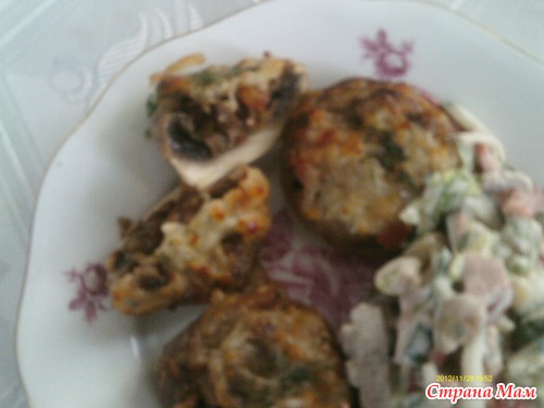 Свинной фарш, мелконарезанный лук обжарить, этой смесью фаршеруем грибы посыпаем тертым сыром в духовку на 30 мин