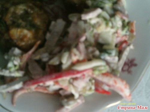 Нарезаем соломкой:перец, соленые и свежие огурчики, ветчину, оливки, докторскую колбасу, зелень, солим перчим и заправляем майонезом