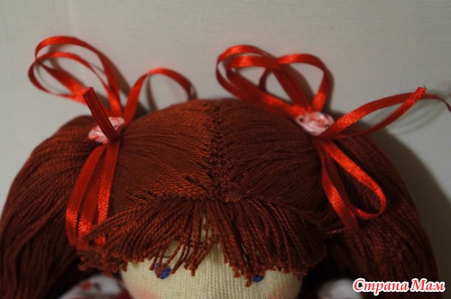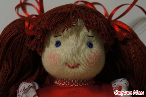У меня вышить не получилось, я уже глазки утянула и паричок пришила, не распустить, пришлось вот искать выход, надо сначало вышить, а потом утягивать, а у меня вот не как у всех