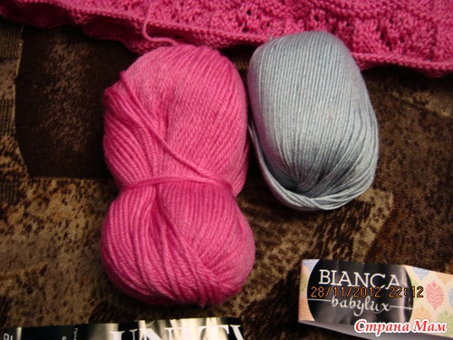 Есть у меня еще нитки, покупала на боснийский бактус + запас на шапочку, но как-то мне не очень понравилось, что получается, и я забросила это дело. А нитки остались, правда метраж не тот, нитки тоньше намного, но если вязать в 2 нити на тех же спицах, то плотность примерно такая же.