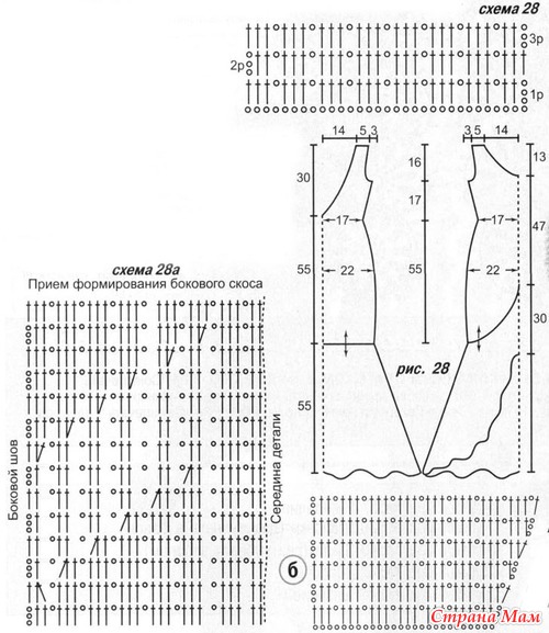 Для начала выполните рабочую выкройку изделия в натуральную величину (см. рис. 28) и откорректируйте по своим меркам. По образцу основного узора (сх.28) и выкройке сделайте расчет необходимого количества петель. Начните работу с верхней части платья. Свяжите спинку, формируя боковые скосы симметрично, с обеих сторон детали в соответствии с выкройкой. Прием убавок и прибавок внутри полотна смотрите на схеме 28 а. Убавления для пройм и выреза горловины делайте по краям полотна. Провязывая по 2С1Н с общей вершиной. Деталь полочки начните вязать из двух частей, выполняя в зеркальном отражении закругления, как показано на схеме 28 б. Через 30 см объедините вязание и продолжите работу единой деталью, формируя боковые скосы симметрично, с обеих сторон детали аналогично спинке. Готовые детали соедините по боковым и плечевым швам. Далее приступайте к выполнению юбки-оборки. Вяжите по кругу от верхней части платья по схеме 28 в. После 8-го ряда вяжите поворотными рядами, увеличивая каждый раз группы недовязанных петель с обеих сторон для формирования закругления в виде шлейфа. По низу шлейфа и вдоль границы верхней части платья и оборки сделайте обвязку пряжей «Травка». Горловину и проймы платья также обвяжите пряжей «Травка»: *1СБН и 3ВП*.
