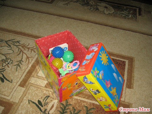 Это коробок для игрушек. Сделан из коробки из-под бумаги А4, внутри обшит поролоном и тканью, есть два кармашка (задумывались для прорезывателей и маленький игрушек-чтобы легче было искать)