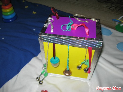 Это "музыкальная шкатулка". Тянешь за ленточку-веревочку и разные звуки: колокольчик, бубенчик, пусто и еще шарик в футлярчике из-под бахил.