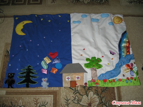 Это развивающий коврик. Там солнышко пищит, облака и речка шелестит как водичка и дождик (полиэтиленовые пакетики внутри). Елочка из красивой ткани, как настоящая. Дверка в домике открывается, там кошечка сидит. В шариках у зайчика в руках разного размера бусинки, ниточки-для тактильного обучения. Бабочки некоторые деревянные, Яблоки на дереве пластиковые. Зайчик пушистый и мишка пушистый.