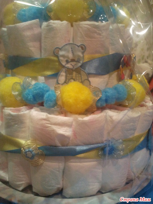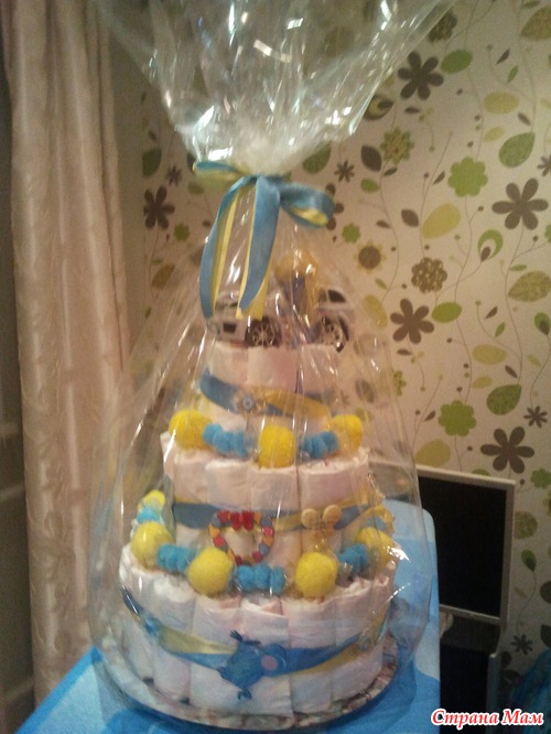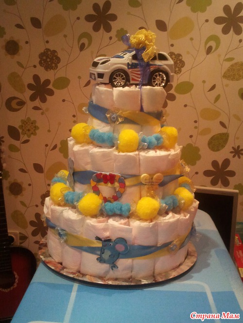 Это торт из подгузников для мальчика. Три яруса.