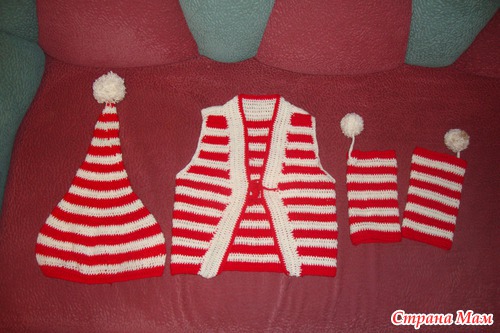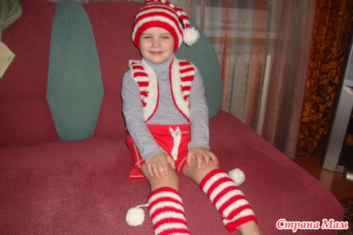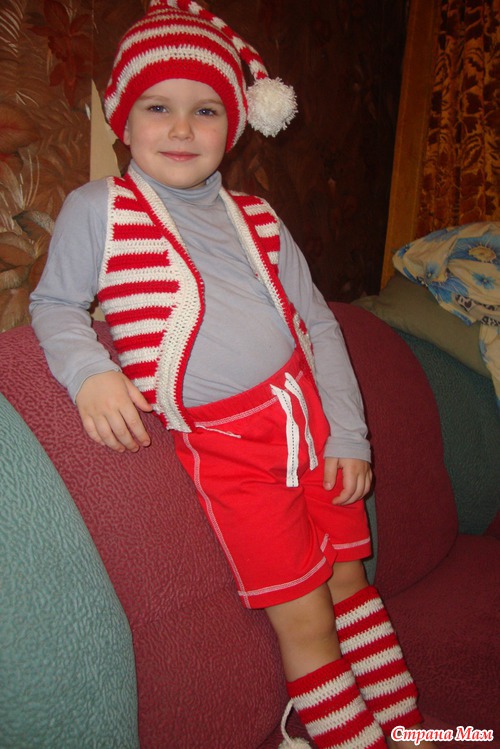Шапку-колпак подсмотрела на просторах интернета, а уж гетры и жилетку придумала сама. Очень сложно с точным описанием, потому как бралось все из головы, но попробую своими словами.
