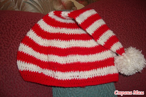 1. Шапочку вязала от узкой части к широкой стобиками с накидом, меняя цвет каждые 2 ряда. Прибавляла на глаз в каждом 3м, 4м, 6м рядах, примеряя постоянно на голову сыночку. В конце работы прикрепила бубончик на колпак.