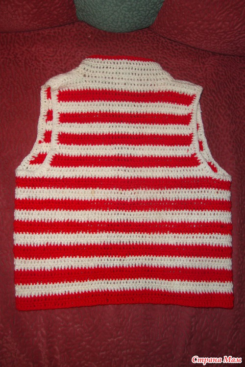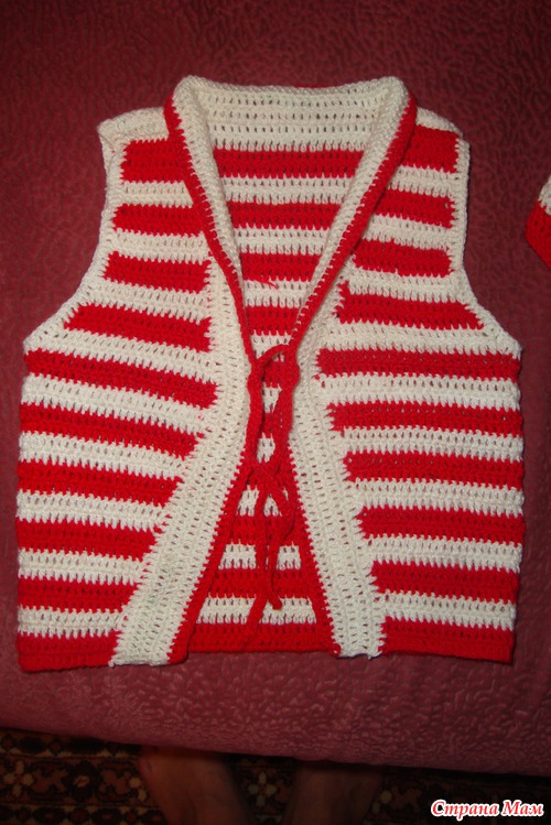3. Жилетку вязала целиком, начиная снизу, до пройм по тому же принципу, что и все остальное. От пройм спинку и полочки вывязывала отдельно, примеряя постоянно на ребенке, на эти примерки и ориентирвалась с убавлениями. Потом "наскребала" остатки ниточек и обвязала полочки еще 5ю рядами столбиков с накидом (4 белых, 1 красный). Проймы также обвязала по одному ряду столбиками с накидом белыми нитками. После генеральной примерки решила сделать завязку посреди полочек, для надежности ( связала цепочку из 100 в. п. и обвязала ее столбиками без накида).