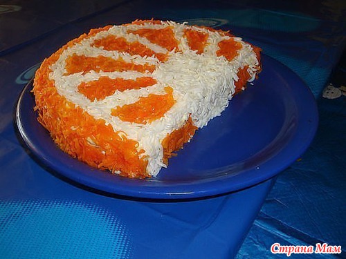 Последним слоем выложить натёртую на мелкой тёрке крупную отварную морковь, майонезом не смазывать. из отложенного белка сделать апельсиновые «прожилки».