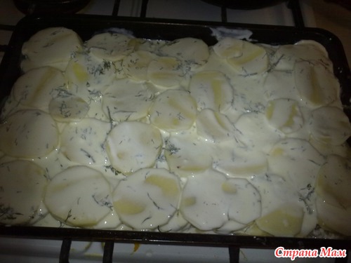 Потом сделала заливку: сметана+яйцо+водички чуть+соль+перец и залила нашу картошку