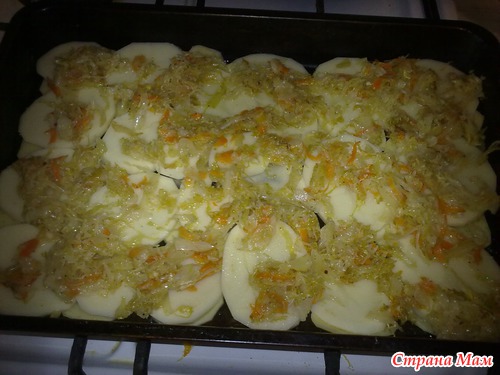 Выложила два слоя картошки, посолила, поперчила и выложила сверху квашеную капусту прожаренную(типа тушеную)