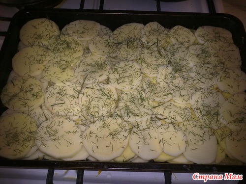 Сверху опять выложила два слоя картошки, пперчила, посолила, посыпала сухим укропчиком(сама сушила