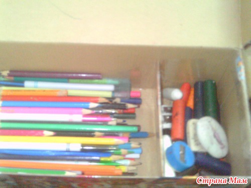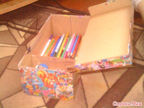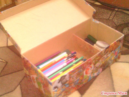 В шкатулке сделали перегоротку, чтоб можно складывать мелкие веши (точилки, мелки...)
