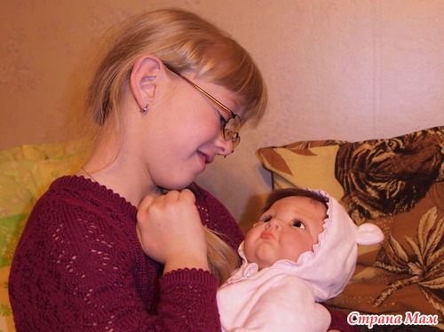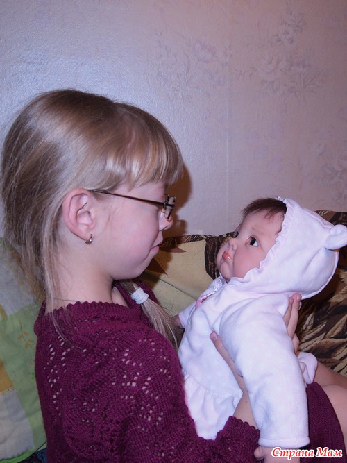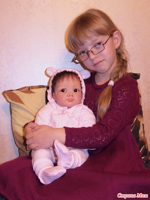 Хочу сразу предупредить, что кукла очень реалистичная, это реборн, была куплена не совсем для игры, т. к. Даша не играет куклами, только переодевает и обновки просит, это больше манекен для вязанной и шитой одежки на малышей. У нас есть старенький пупс, но меньше размером и не вся одежда на него подходит. Эта малышка из Германии, ехала к нам два месяца, но она того стоит, что бы так долго ждать