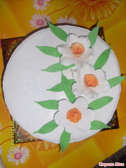 Привет страномамочки, вот наконец-то закончилась эта неделя, 5 тортиков в один день жуть, в холодильнике места не хватает, так что уговорила заказчицу ей на воскресенье, забрать на следующий день. Начнем свадебный торт многострадальный мой, заказчица хотела то расписной айсингом, то лилии с розами и мелкими цветочками, с лилиями намучилась, больше делать не буду. Места по бокам мало лилию сажу, листья ломаются, целая гора этих листиков, еле три собрала и то в итоге получились 5 листовые, внутри торт вечер, крем шарлотт, мастика офигительная, вес 8,5 кг