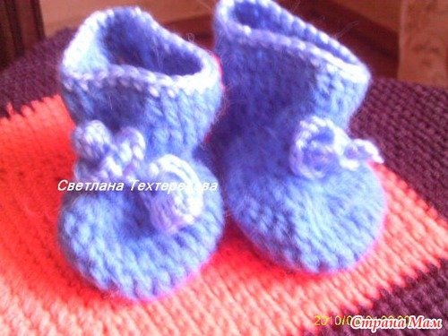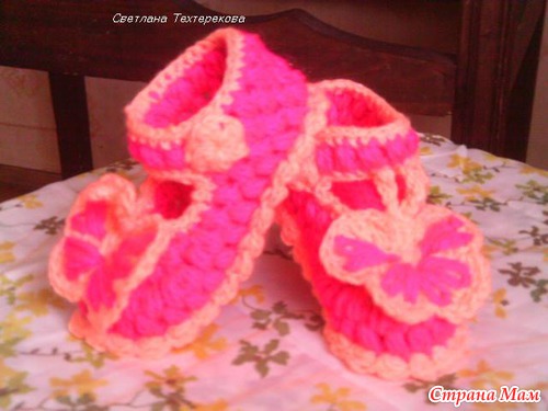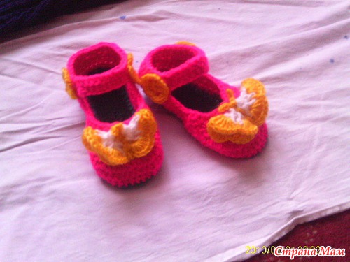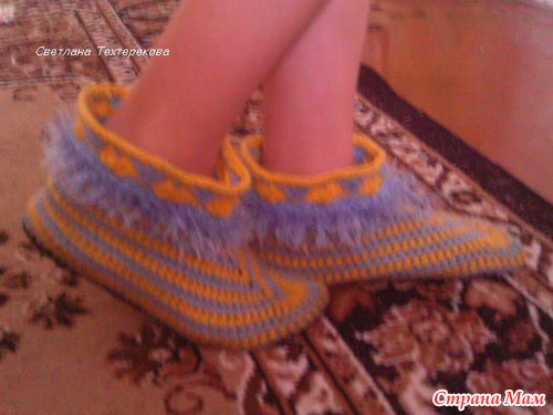 описания розовых с помпонами тапочек нет,могу сказать ,что вяжутся они от подошвы -сначала мыс ,потом как бы привязывается задняя часть и дальше вяжется по кругу,а вторые-тоже от подошвы ,но делаем убавления по 5 полустолбиков сразу в цнтре мыска-мне часто лень искать описания в интернете,поэтому по картинке придумываю сама
