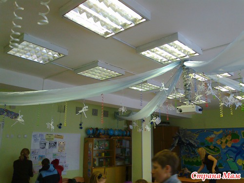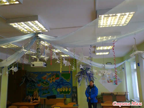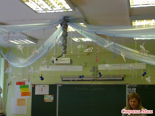 В этом году задали тему для всех классов - "Новогодний серпантин". Конечно, что-то конкретного по этой теме придумать сложно. Зато выбор и полет фантазии не ограничен. Генератором идей была я. Еще весной пришла идея использовать полотнища ткани для украшения класса, а идею с балеринками я подсмотрела здесь