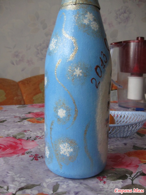 Сначала хотела сделать их серебристой краской, но они получились серые(((потом покрасила заново белым. Думаю, что горлышко тоже нужно было оставить золотым, а не красить в голубой цвет.
