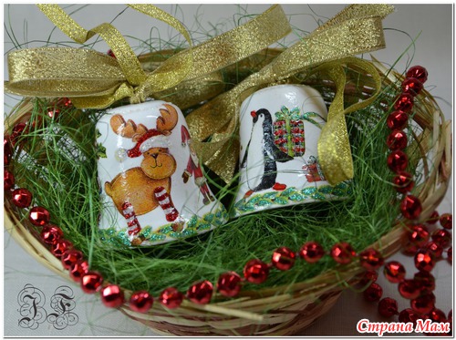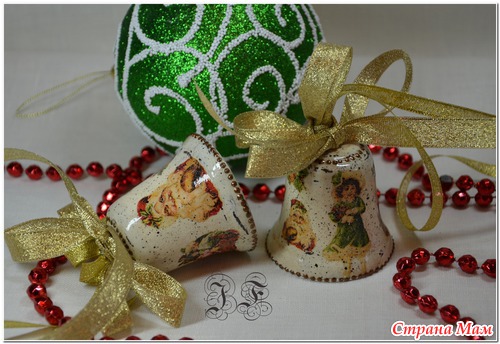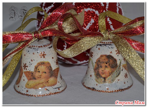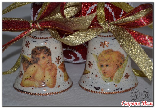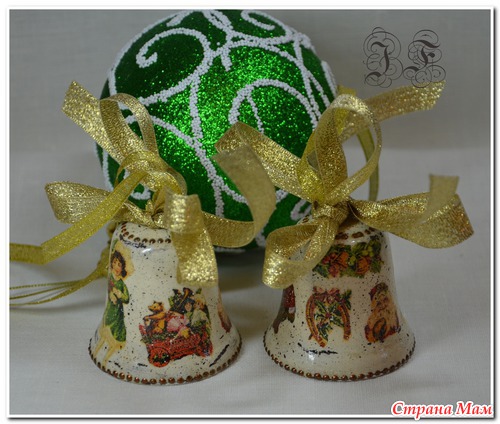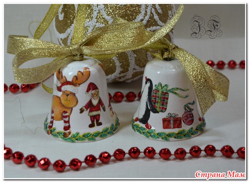 Ссылки конкретно на колокольчики не видела - но вообще делаются как любой декупаж - сначала грунт, потом окрашиваем в цвет фона акриловыми красками, клеим салфетку, лак, и украшаем - кто на что горазд - блестки, контуры и пр..