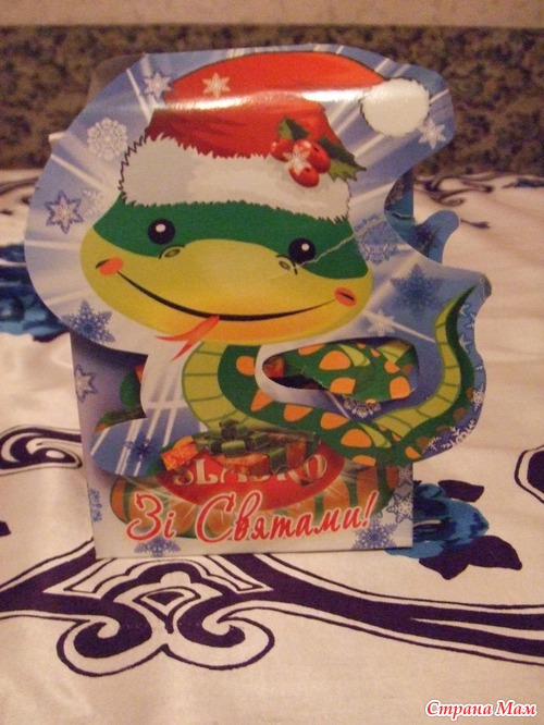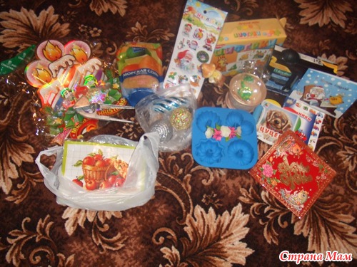 Забыла о сладеньком написать. Пока я занималась раскладыванием и фотографированием своих подарочков, маленький сладкоежка утащил конфеты, мы даже и заметить не успели, как в коробочке была "выгрызена" дырочка и конфеты потихонечку начали испаряться. Вот примерно так все и было
