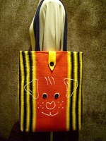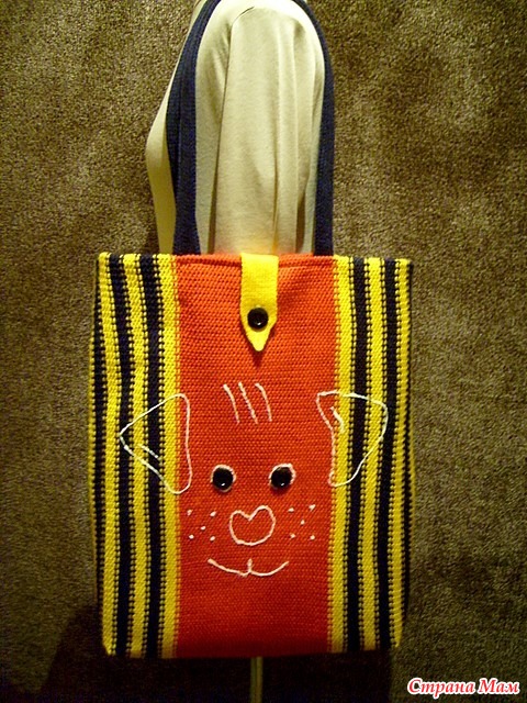 Вязала обычной лицевой гладью, потом полотна отпарила и с изнанки утюгом приклеила "клеевую" ткань. Получилось качественное плотное полотно. Сделала на нем роспись акриловыми красками--контуры-на одной щенок, на другой киска. А третья сумка просто с отделкой и кнопками. Внутри подкладка-подкладочная ткань.