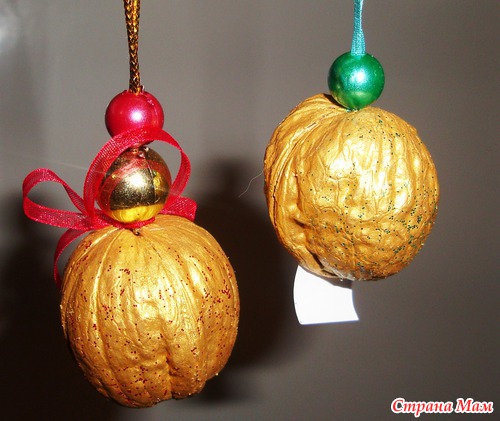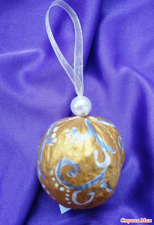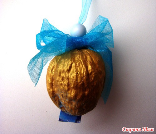 А именно, увидела я как то по телеку в одной из передачь такую идейку.. и слямзила ее... Решила делать из грецких орешков новогодние сюрпризы... Сюрприз заключается в том, что в каждом орешке находится новогоднее предсказание на будущий год)) И каждый орешек я выкрашиваю в золотой, серебряный и бронзовый цвета... Можно по желанию украсить орешек, как заблагорасудится... в дальнейшем можно орешек использовать как елочное украшение, для этого краешек предсказания желательно оставить снаружи, чтобы не вскрывать орех, а просто вытянуть бумажечку с заветными словами)))