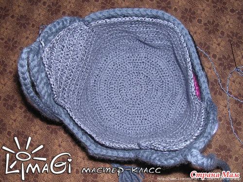 Дальше вяжем полностью основу с ушками/завязками как обычную шапку (с учетом добавки в размере). У меня она слегка больше посчитанного размера сознательно - чтоб потом отпороть подклад и носить дальше шапку весной, так как девочка еще маленькая и быстро растет головка. Пришиваете сразу всю отделку на основу (цветы/усы/глаза/уши/бусины и все такое), чтобы потом не захватывать подклад нитью - это очень испортит шапку. Да и все грехи пришивания и концы нитей спрячутся между верхом и подкладом.