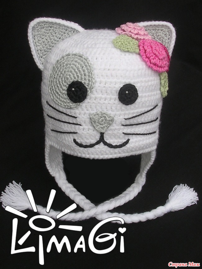 Дальше вяжем полностью основу с ушками/завязками как обычную шапку (с учетом добавки в размере). У меня она слегка больше посчитанного размера сознательно - чтоб потом отпороть подклад и носить дальше шапку весной, так как девочка еще маленькая и быстро растет головка. Пришиваете сразу всю отделку на основу (цветы/усы/глаза/уши/бусины и все такое), чтобы потом не захватывать подклад нитью - это очень испортит шапку. Да и все грехи пришивания и концы нитей спрячутся между верхом и подкладом.