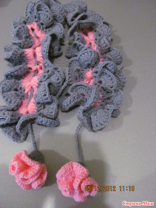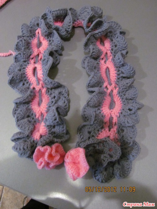 А я своей дочке такой же шарфик связала, но она не хочет его носить. Из-за обилия рюшечек ей неудобно (дочке почти 4 года).